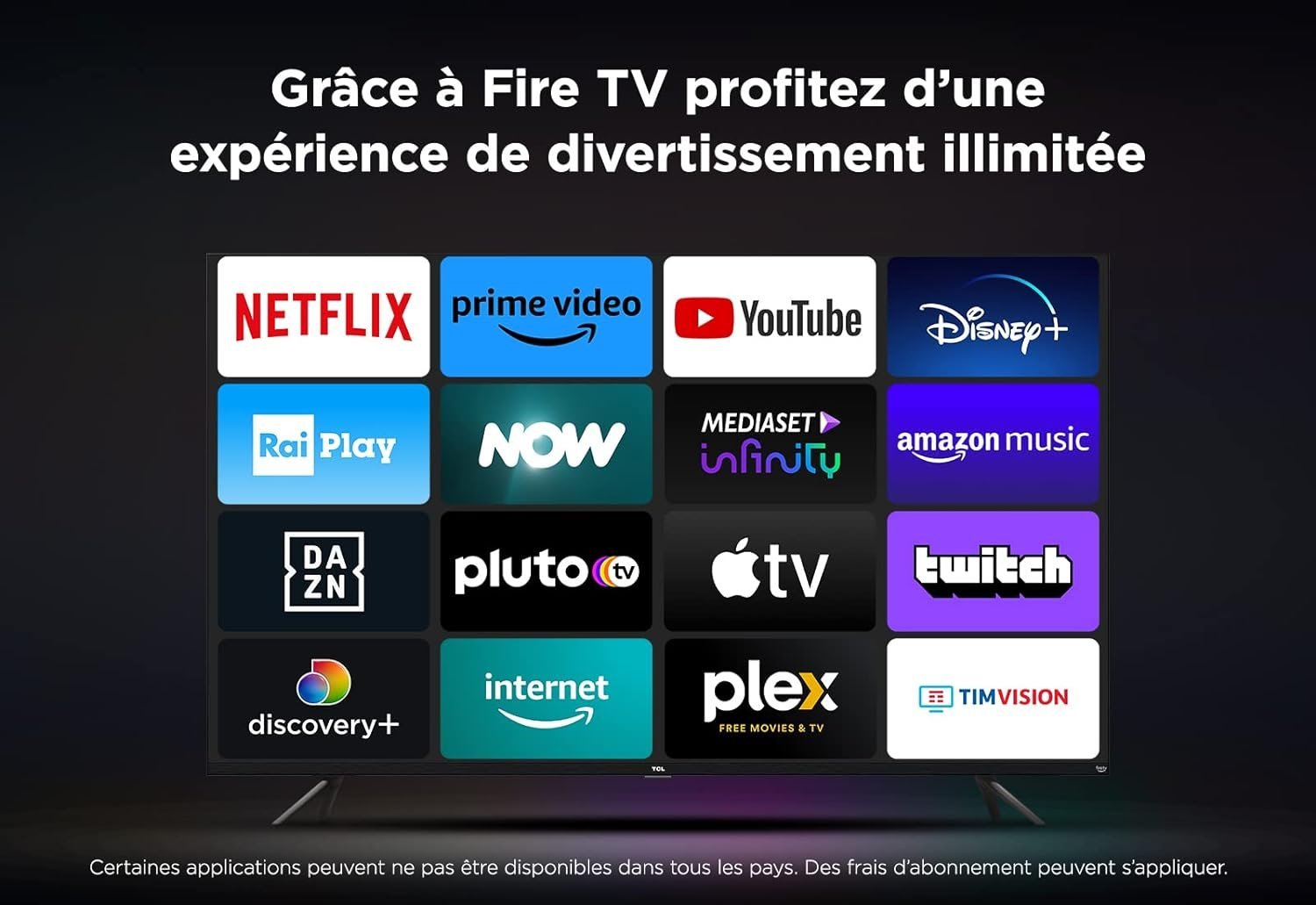 • Divertissement sans fin: avec Fire TV intégré, amusez-vous sans contrainte avec les milliers d’applications et des chaînes, parmi Netflix, Prime Video, YouTube, Disney, MyCanal, Molotov et beaucoup plus d’autres. (des frais de souscription peuvent s’appliquer.)